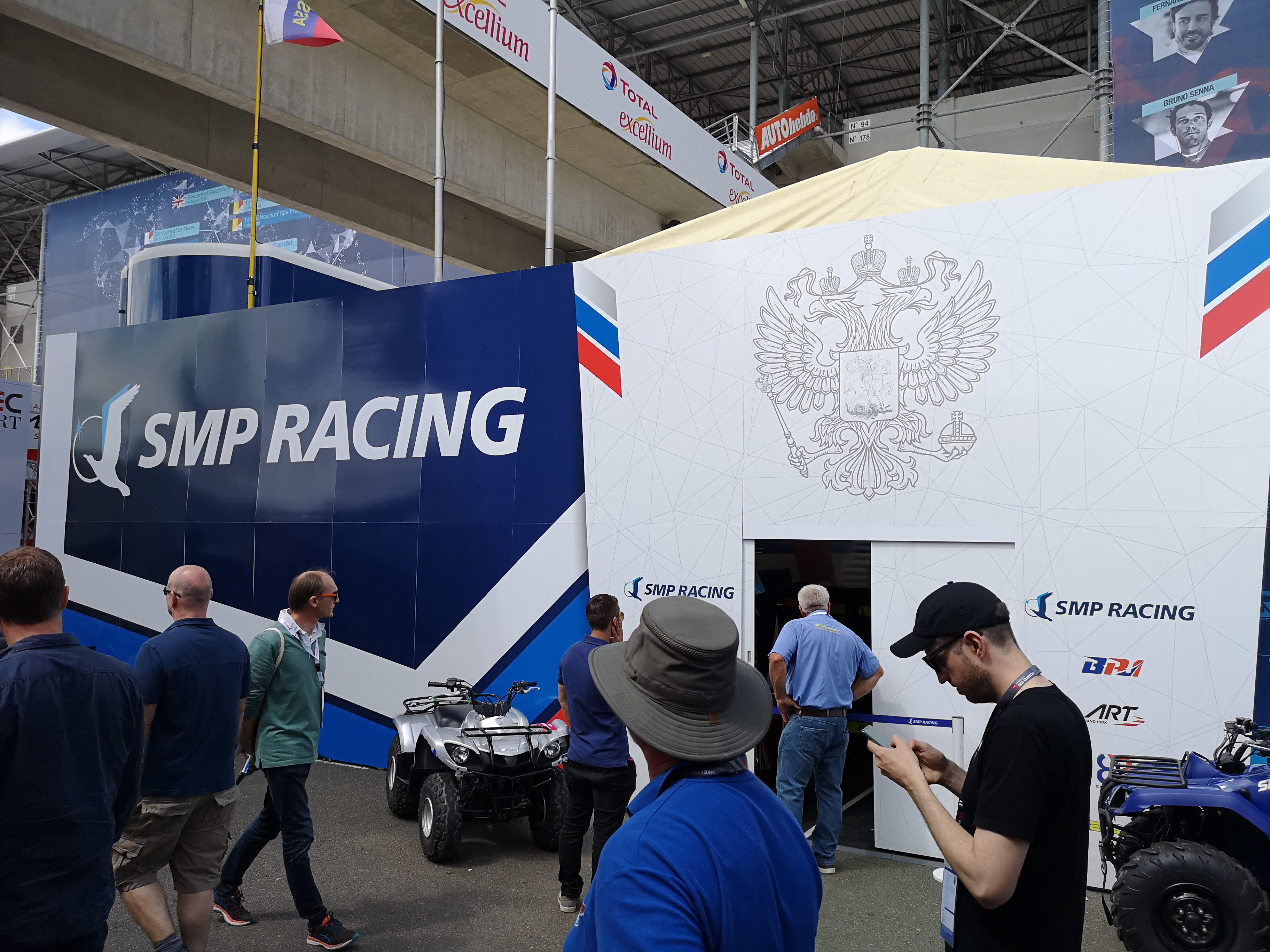 The entrance to the SMP Racing pit garage viewed from the paddock thoroughfare.